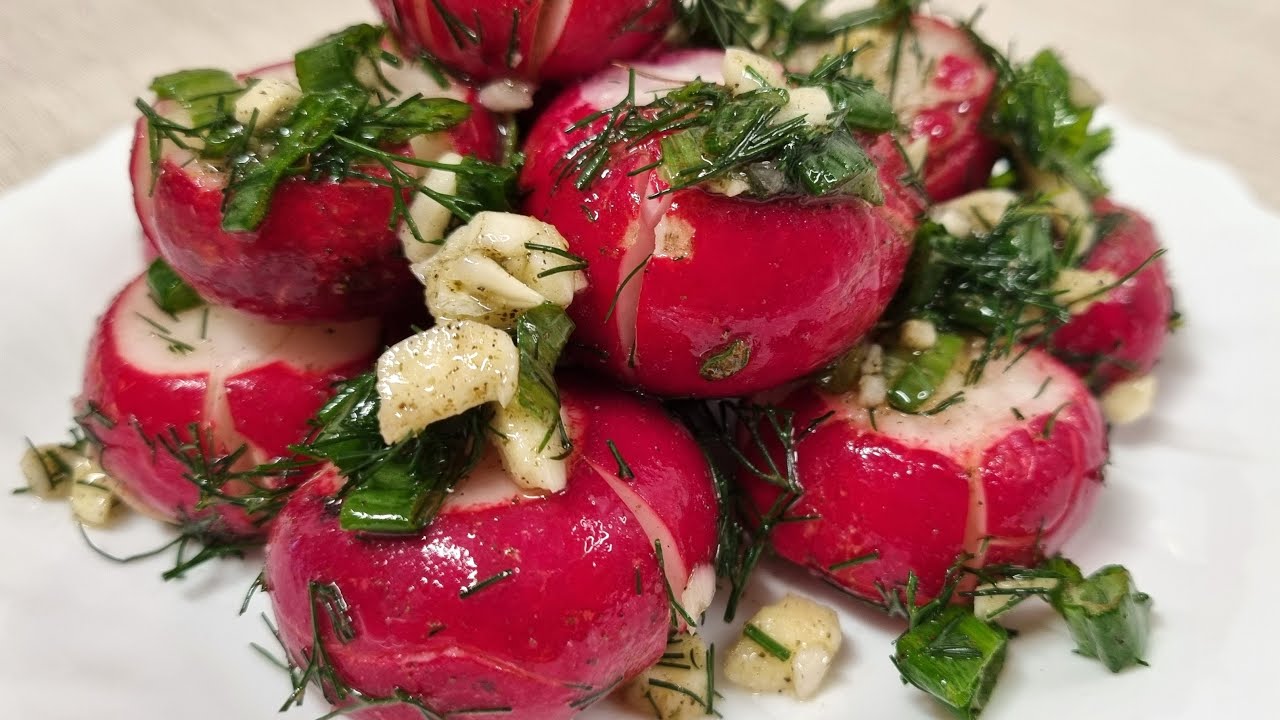Потім у мисці змішують воду, оцет, олію, сіль, цукор, перець і подрібнений часник. Все перемішують і заливають цим маринадом редиску. Додають рубану зелень і ставлять у холодильник хоча б на 30 хвилин. До мʼяса ідеально!