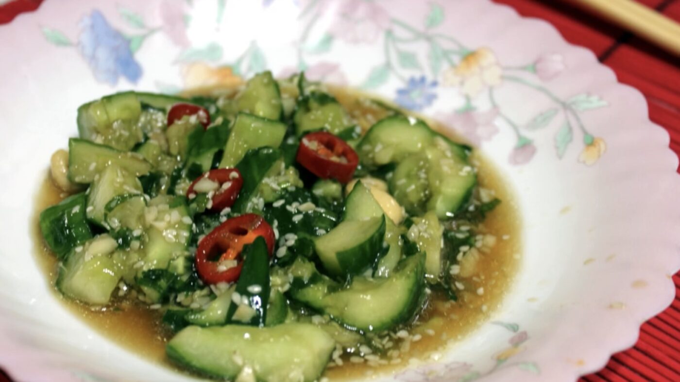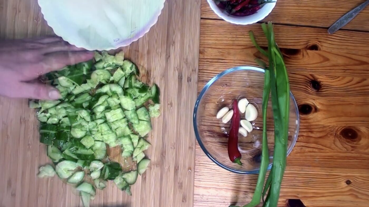 Огірки миють, відрізають кінчики й злегка плющать качалкою або боком ножа — так, щоб тріснули, але не розлізлись. Потім ріжуть на товсті шматки.