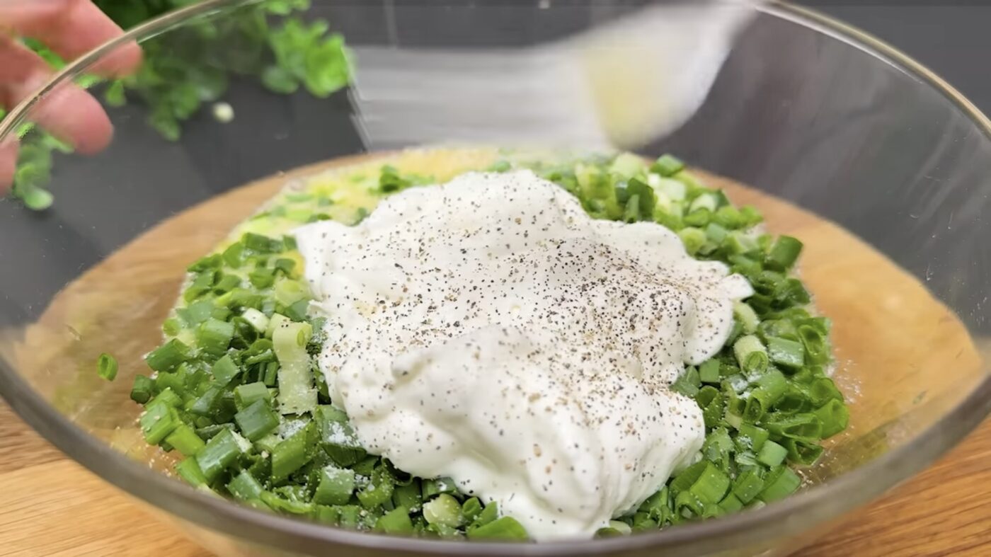Поки смажиться картопля, готується заливка. У мисці збиваються яйця зі сметаною, додається дрібно порізана цибуля, половинки помідорів чері, натертий сир моцарела, сіль, перець і зелень. Масу потрібно добре перемішати.
