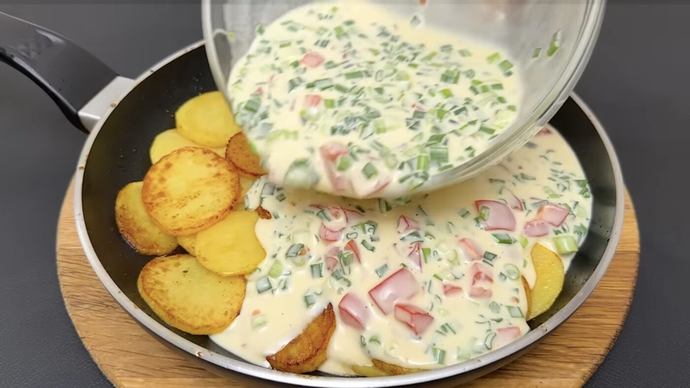 У сковорідку, де смажилась картопля, викладаються ту саму картоплю шарами. Зверху рівномірно заливається приготовленою сумішшю.