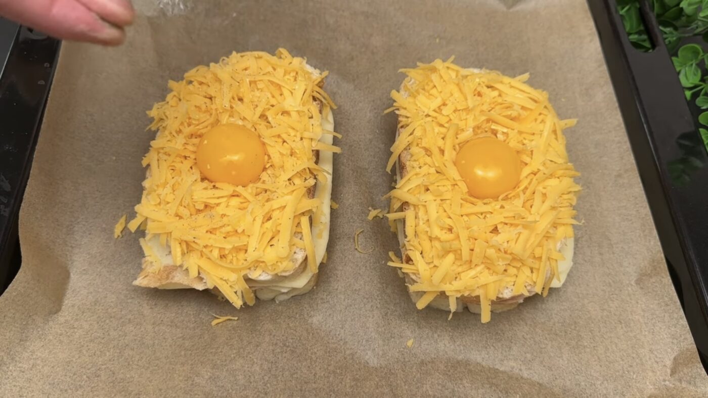 Сендвічі викладаються на деко з пергаментом. Зверху посипаються тертим сиром. У центрі кожного тосту робиться невелика ямка, в яку обережно вбивається жовток. Трохи солі, перцю, зелень — і страва готова до запікання.