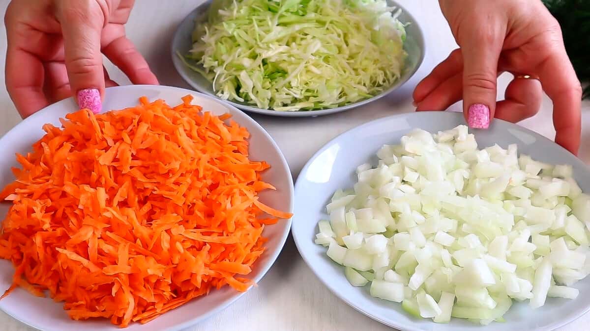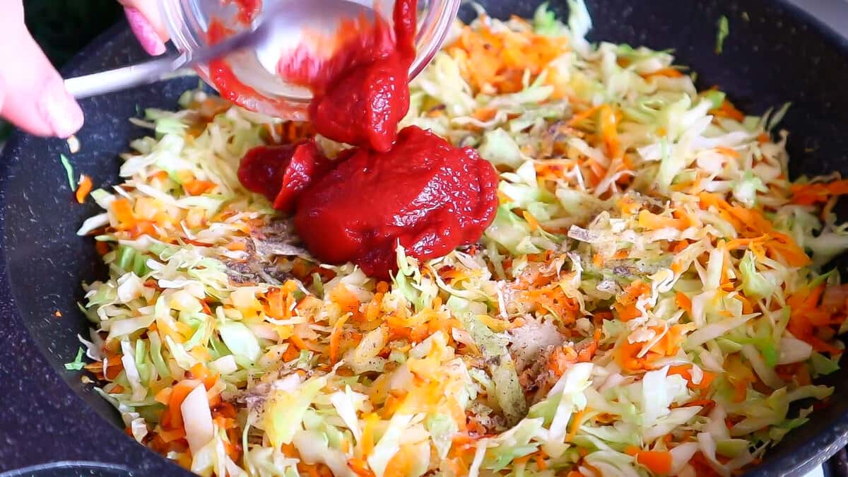 Для початку цибулю потрібно нарізати кубиками, а моркву натерти на кухонній тертці. Молоду капусту потрібно нашаткувати соломкою. Смажте цибулю протягом кількох хвилин, додайте до неї моркву та смажте до готовності. Додайте капусту, перемішайте. Тушкуйте овочі протягом хвилини, потім додайте до них сіль і перець на смак, томатну пасту. Продовжуйте тушкувати ще протягом 1 хвилини.