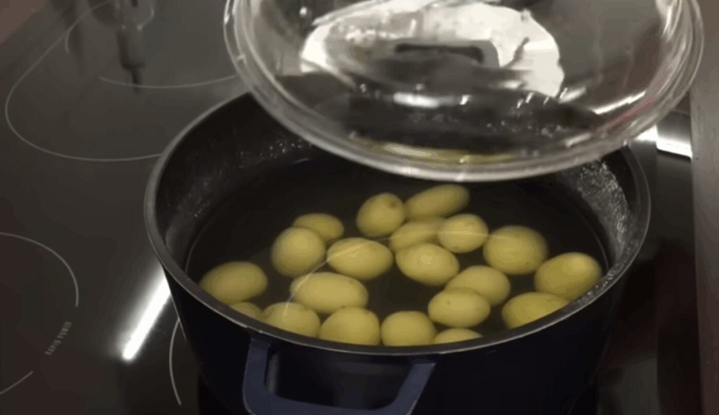 Підготовлену картоплю кладемо у каструлю, повністю заливаємо водою, додаємо сіль і ставимо на плиту. Після закипання варимо на слабкому вогні близько 20–25 хвилин.