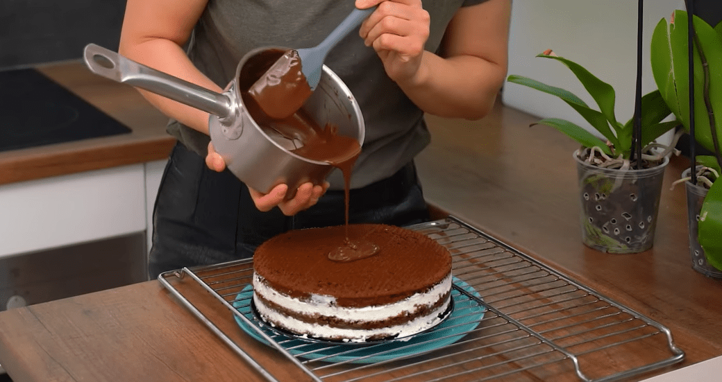 Готовим кремом перемащуємо коржі, а зверху торт заливаємо шоколадною глазур’ю.