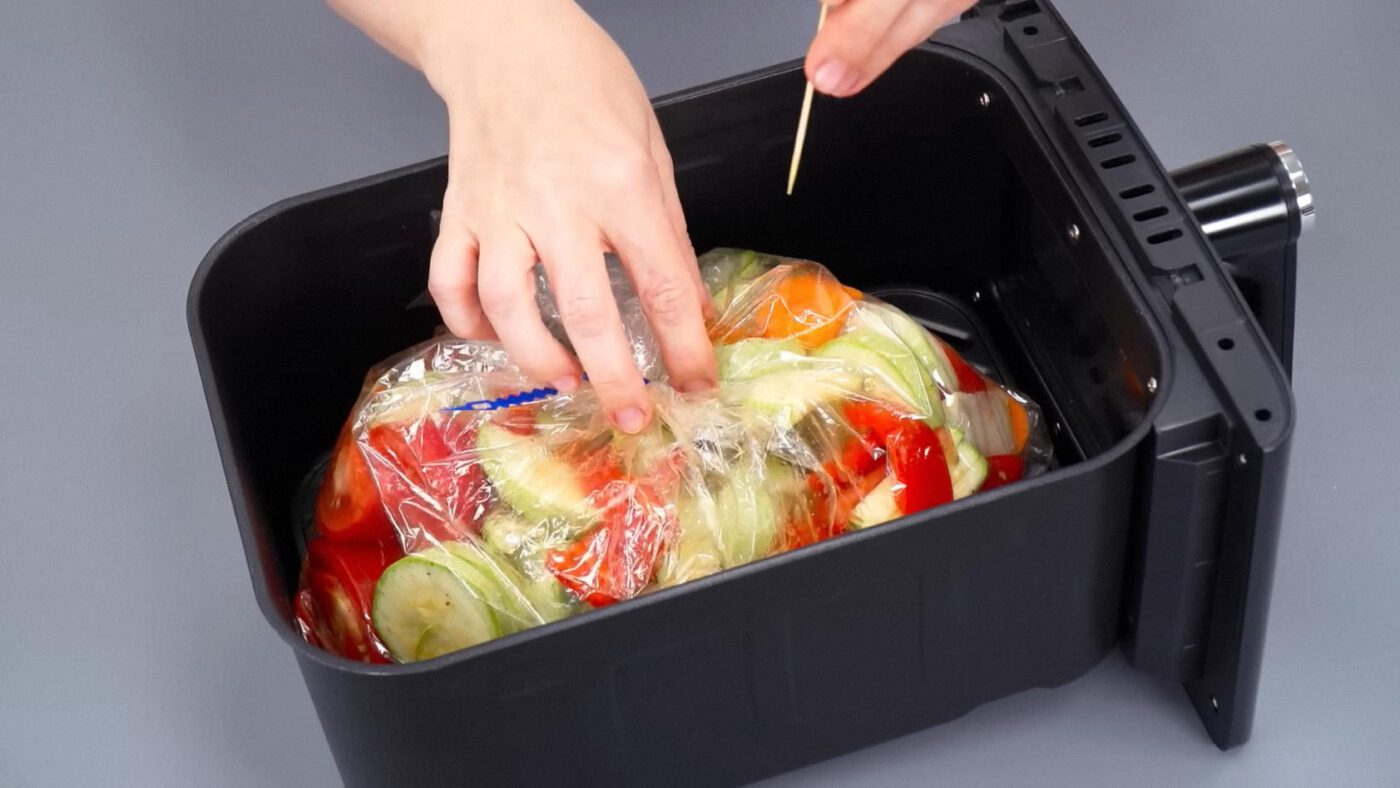 Складіть овочі у рукав для запікання. Туди ж додайте 2-3 столові ложки олії, рівномірно поливши її зверху, сіль та трішки меленого перцю. За бажанням можете також додати копченої паприки для аромату димку та насиченішого смаку. Зав’яжіть рукав та запікайте овочі в духовці чи аерогрилі протягом 45 хвилин при 180°C.