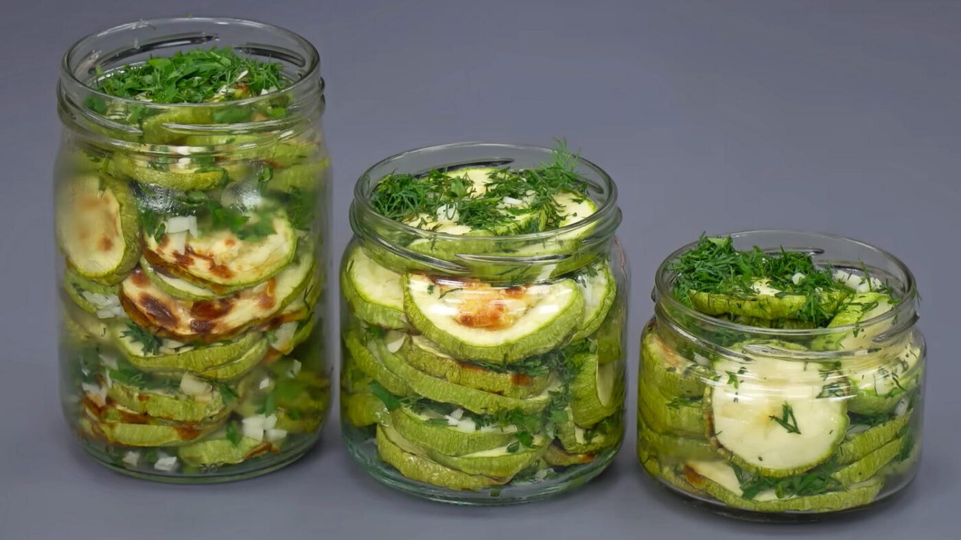 Після цього можна збирати консервацію в банки. На дно сиплеться трішки часнику й зелені. Потім 2 шари кабачків, знову часник і зелень, знову кабачки. Так поки не заповните банки до кінця. Залийте маринадом доверху, накрийте фольгою та поставте в духовку чи аерогриль на 10 хвилин при 120°C + 5 хвилин при 150°C. Після цього одразу ж закрийте банки чистими кришками, закутайте до охолодження та можна ставити в льох на зберігання.
