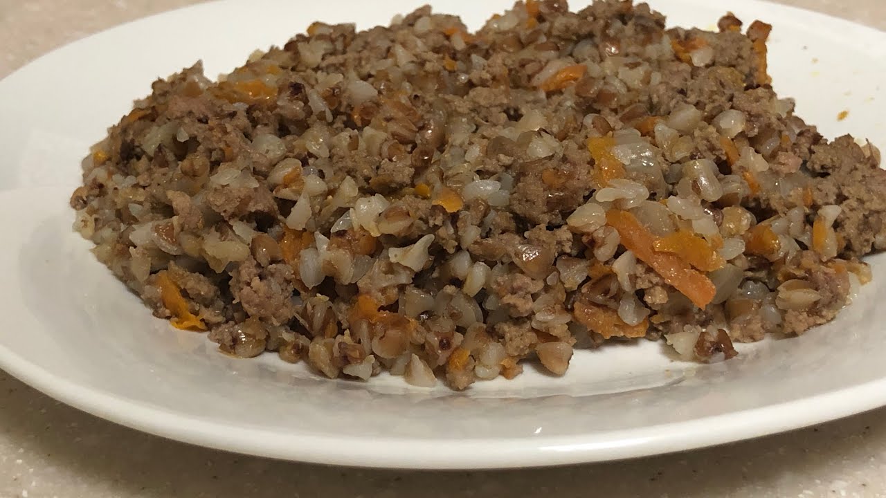 Беремо оту гречку — не багато й не мало, грамів триста. До неї додаємо фарш — найліпше яловичий або такий, що з двох видів м’яса, він буде м’якіший для ліплення. Якщо є сир, ще краще: натерти трохи — і в страву, він там потім гарно тягнеться. А ще пів морквини й пів цибулини ріжемо дрібно, ніжно, по-домашньому, й на сковорідку. Нехай овочі пустять сік і такім стані протушкуються хвилин 7-8.