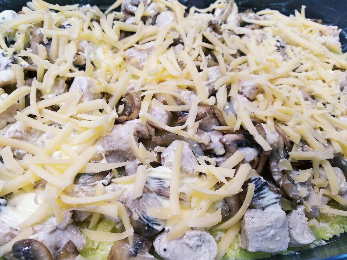 Ввечері поставте варитись картоплю та, дочекавшись, поки після приготування вона охолоне, поставте її у холодильник. Наступного дня поставте розігріватись духовку до 180 градусів, а тим часом підготуйте всі інгредієнти. Картоплю перетворіть на пюре та викладіть у форму для запікання, яку змастили олією. Наступним кроком помийте та наріжте гриби невеликими шматочками.