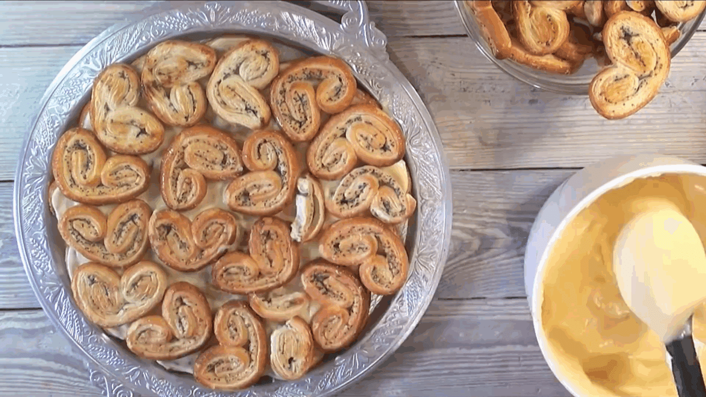 Основний секрет, чому такий торт готується у декілька разів простіше, полягає у використанні готового магазинного печива “Вушка” – того самого із листкового тіста. Його потрібно просто змастити заварним кремом і насолоджуватись смаком десерту. Вам знадобляться такі інгредієнти: