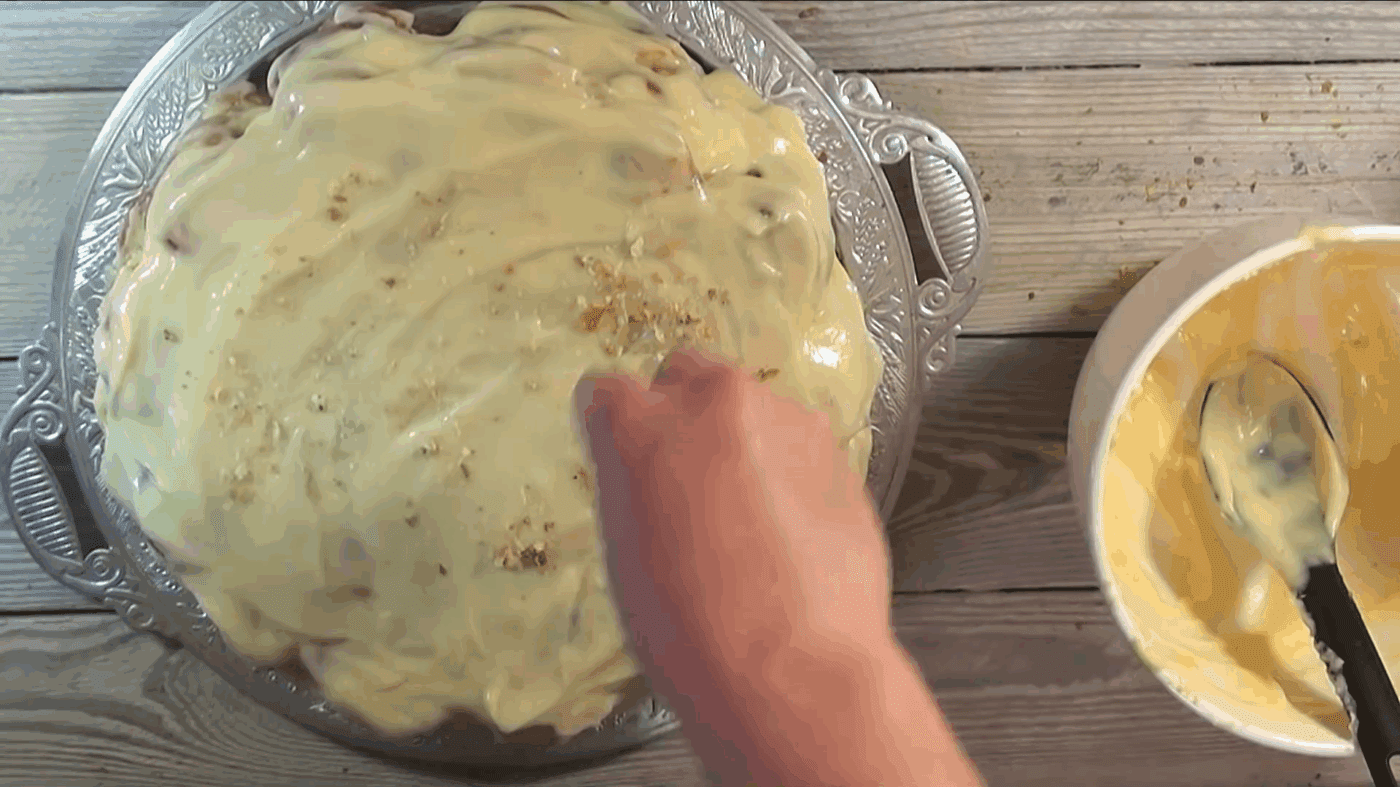 На дно форми для торта викладіть трішки крему. На нього покладіть перший шар печива рівномірним шаром – можна розділити його на декілька шарів. Зверху змастіть печиво кремом. Так продовжуйте викладати шари, чергуючи печиво та крем. Останній шар печива полийте кремом і посипте крихтою із залишків печива. Форму залиште в холодильнику на 2-3 години, а потім дістаньте його та наріжте на маленькі порційні шматочки.