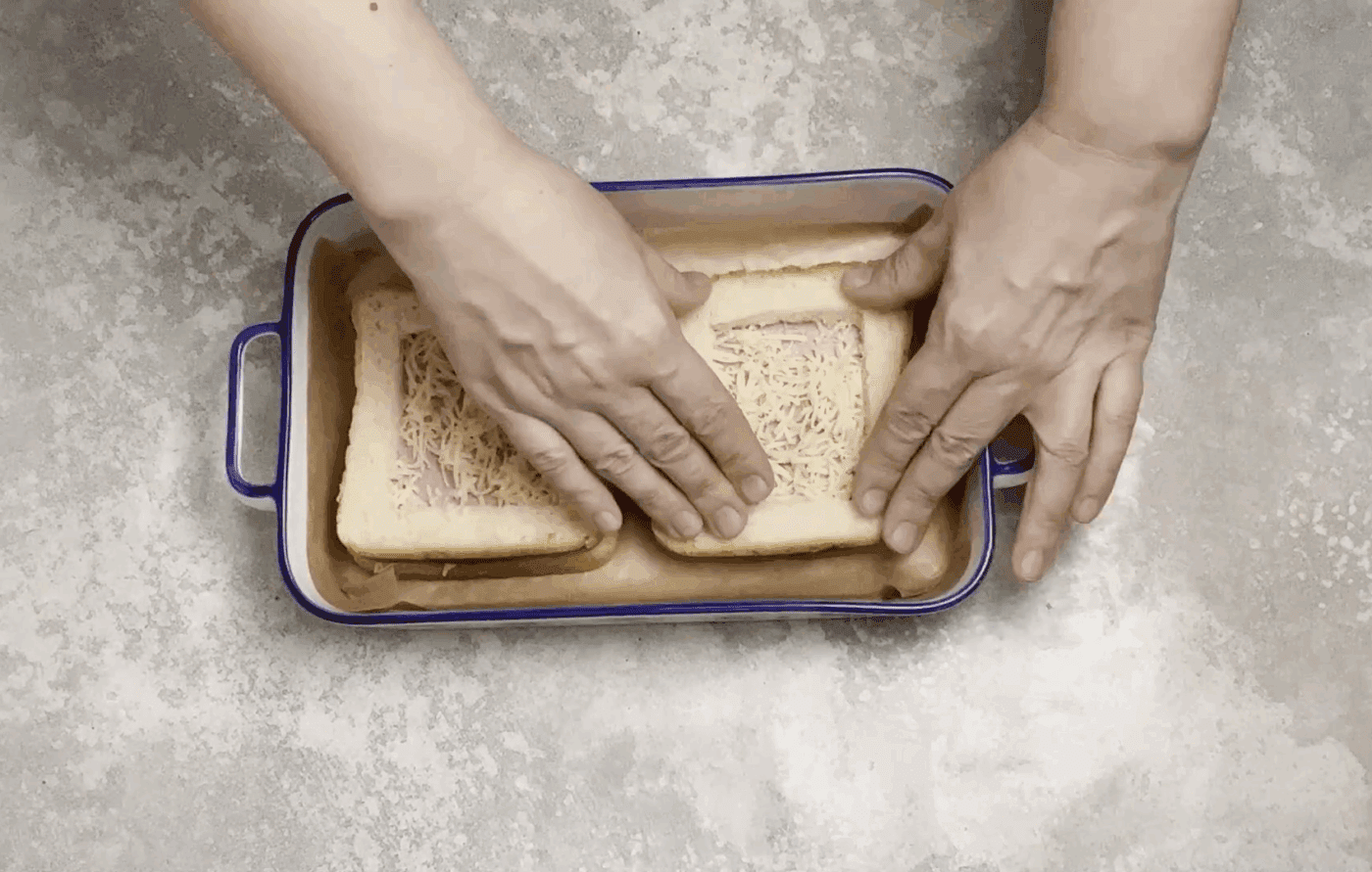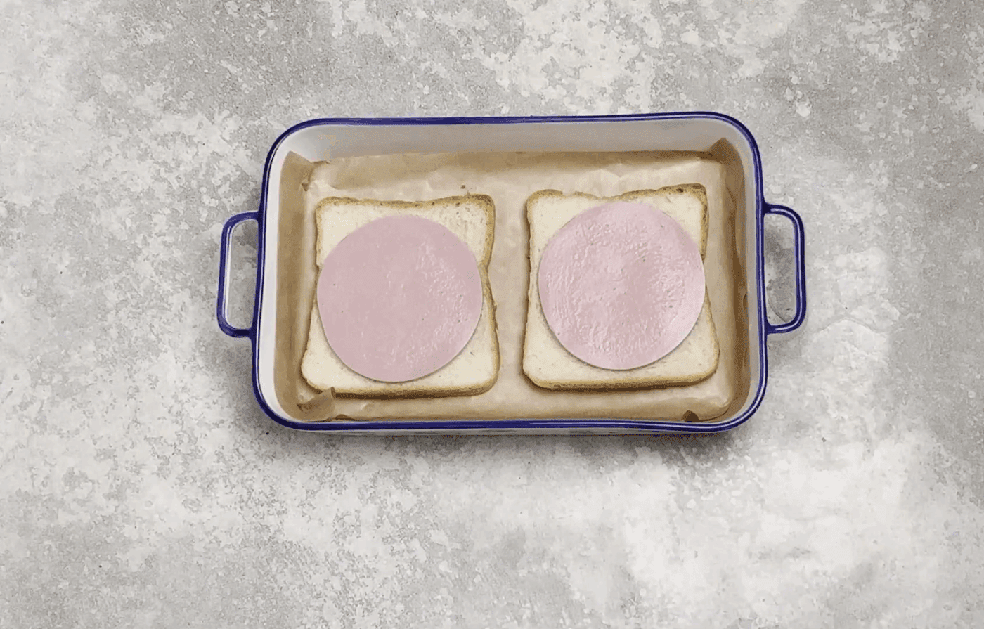 Для початку потрібно поставити духовку розігріватись до температури 180 градусів. Наступним кроком змастіть деко невеликою кількістю рослинної олії та викладіть тостерний хліб – скільки поміститься на ваше деко. Зверху змастіть хліб улюбленим соусом. Наріжте шинку (або купуйте одразу нарізану для зручності). Плавлений сир скибочками викладіть на шинку.