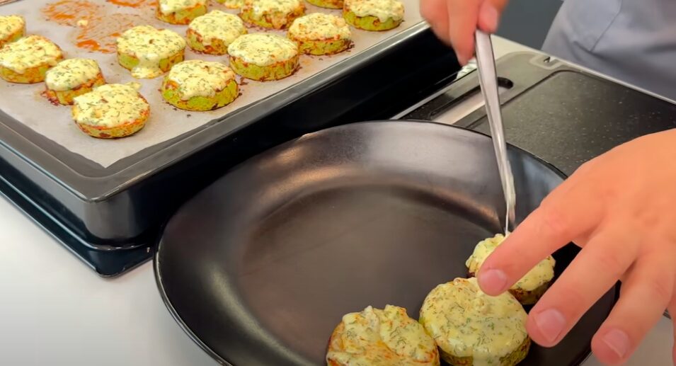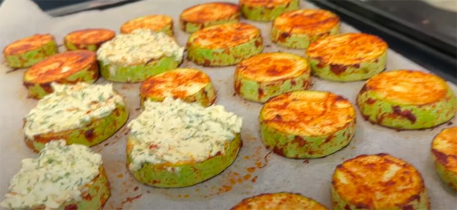 Ножем намастіть на кожне кружальце кабачка сирний соус. Поверніть до духової шафи. Достатньо буде витримати 1-2 хвилини, і все – справу зроблено. Ароматні кабачки вже парують на столі.