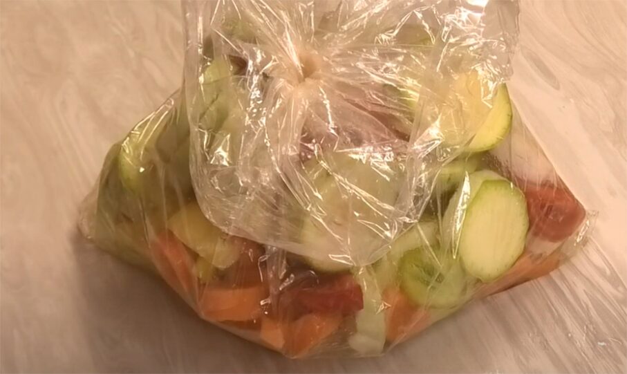 Потрусіть пакет, щоб усе перемішалося, й закрийте кліпсою. Робіть це не дуже щільно – залиште невеличкий отвір. Відправте у мікрохвильову піч на 20 хвилин. Виставте потужність 900 Вт. Якщо є вільний час, можете запекти у духовці за температури 180 градусів. На це піде 1 година.
