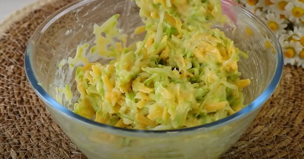 Ретельно перемішайте масу ложкою. Залежно від розмірів яєць та вологості кабачкової маси борошна може знадобитися трішки більше чи навпаки менше. Кабачок під дією солі напустить ще соку, тому робіть усе якомога швидше.