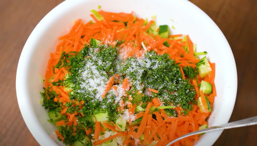 Без зайвого клопоту на вечерю домашнім можна приготувати салат із молодої капусти. Якщо додати моркву, а ще огірок та зелень, вийде дуже цікаве поєднання. Улітку така страва радуватиме хоч щодня.