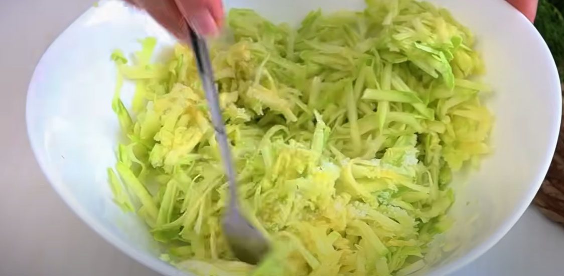 Кабачок натріть на тертушці. Посоліть та відставте вбік, допоки замішуватимете тісто. У миску влийте кефір, вбийте яйця, влийте олію. Додайте цукор та сіль. Усе перемішайте. Додайте просіяне борошно та соду. Ще раз перемішайте. Кабачок відтисніть руками, щоб від’єднати рідину. Суху овочеву масу додайте в тісто. Перемішайте.