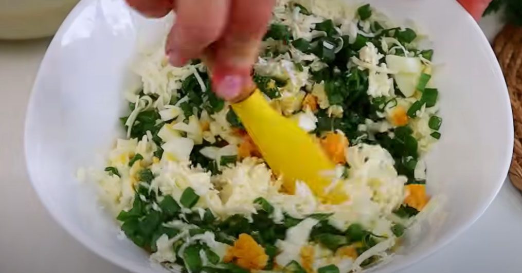 Тепер робитимемо начинку. Зварені круто яйця обчистьте та наріжте кубиками. Змішайте з подрібненим пучком зеленої цибулі. Плавлені сирки дістаньте з морозильної камери та натріть на тертушці. Трішки присоліть. За бажанням, додайте чорний мелений перець.