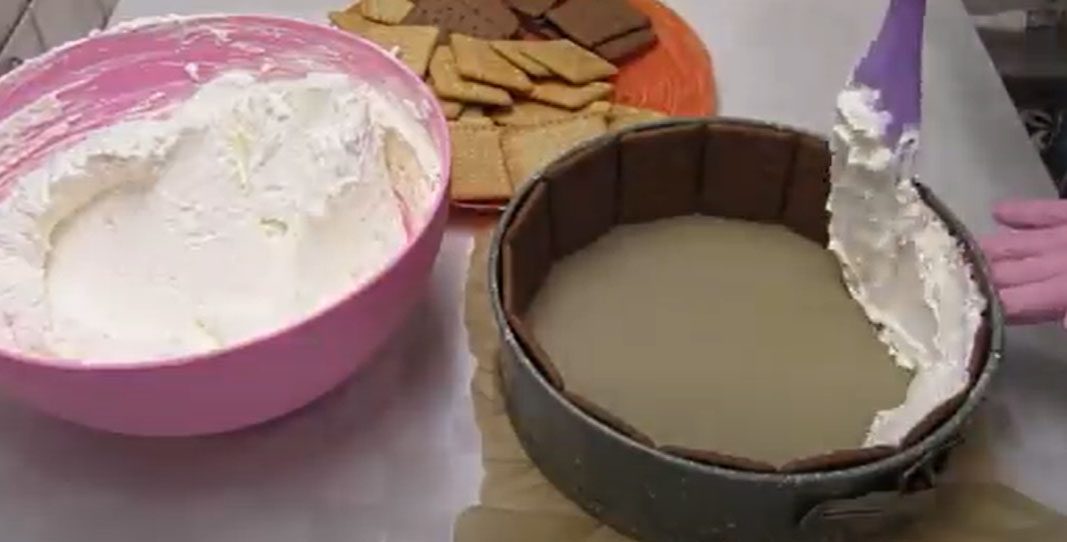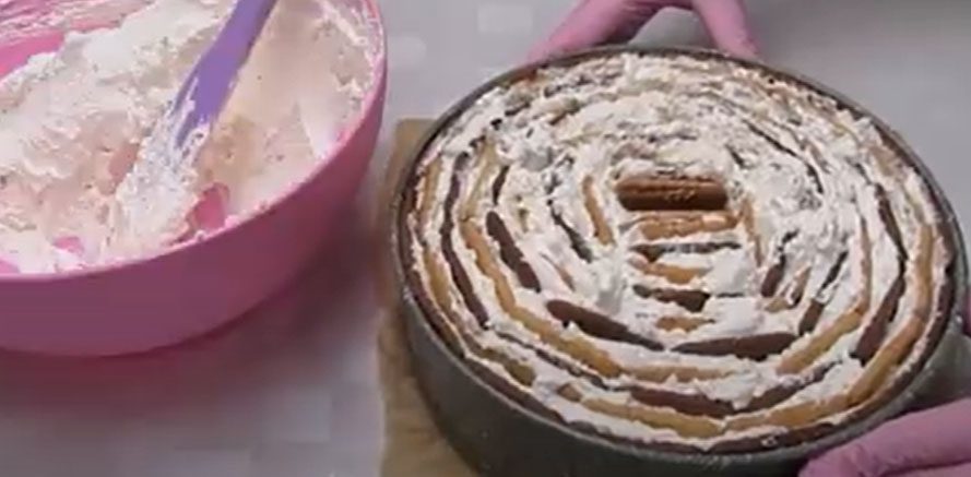 Коли дійдете до центру, залишиться отвір, який заповніть білим та шоколадним печивом. Викладайте печиво та крем дуже щільно, щоб не залишалося пустот. Решту крему викладіть поверх торта. Залиште “Зебру” на 30 хвилин за кімнатної температури. Потім переставте у холодильник.
