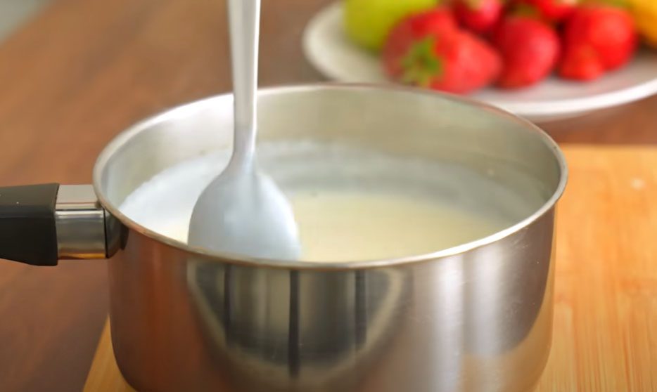 Щоб приготувати фруктово-молочний десерт, відлийте 100 мл молока та охолодіть. Решту 700 мл перелийте у сотейник та поставте на плиту. Допоки підігріватиметься, постійно перемішуйте, щоб не підгоріло.