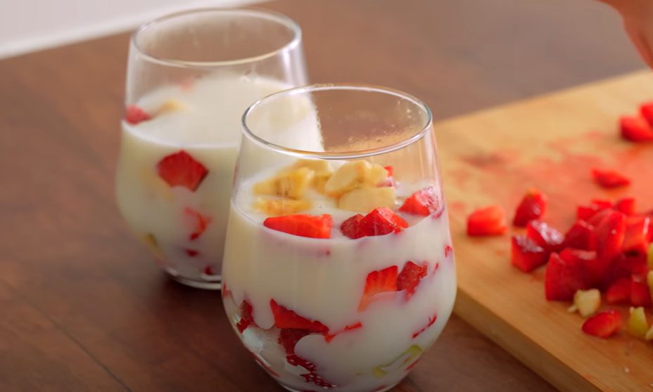 Якщо охолодити у холодильнику, то молочний десерт сприйматиметься як морозиво. Страва тонізуватиме й освіжатиме спекотного літнього дня. Комбінацію фруктів чи ягід можете підібрати на власний смак.