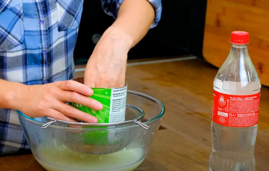 Поставте бляшанку з дірочками на друшляк. Закладіть у неї сирну заготвку разом із марлею. Накрийте кришкою та придавіть 1-літровою пляшкою з водою. Цього буде достатньо.