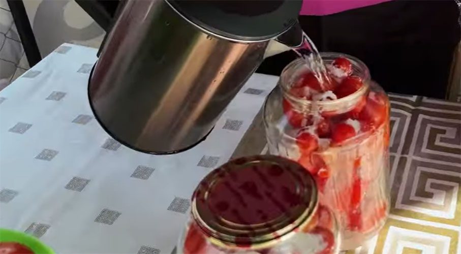 Залийте крутим окропом до самого верху. Закрутіть металевою кришкою. Потрусіть слоїк, щоб кристали розчинилися. Переверніть догори дном. Укутайте теплим рушником і залиште холонути природним шляхом.