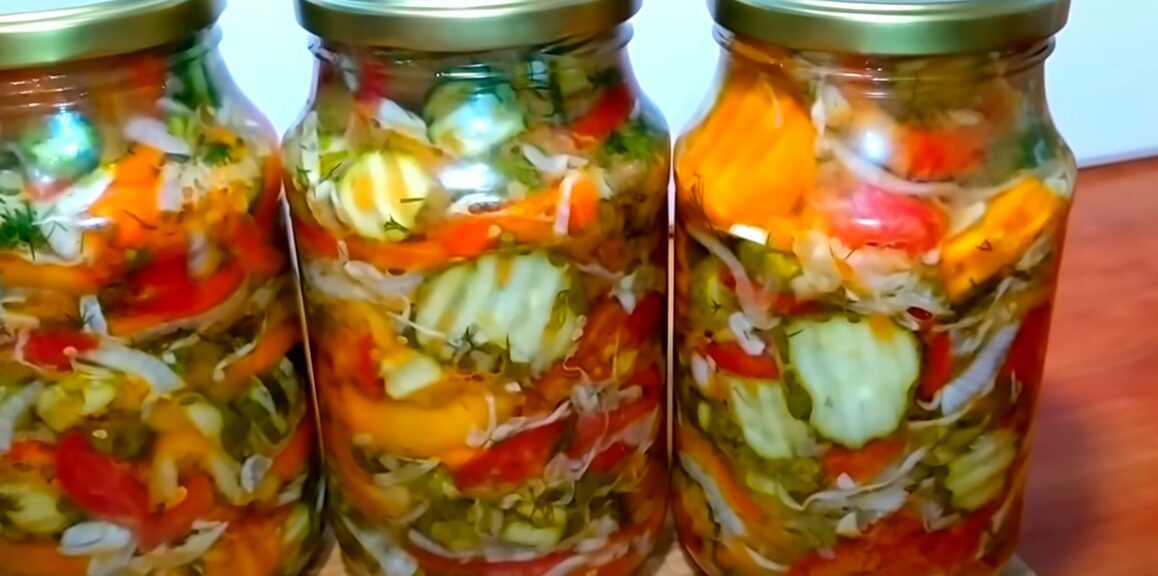 Тепер розкладайте салат по слоїках, легенько утрамбовуючи. Розлийте по банках сік, що виділився з овочів. Візьміть довгу шпажку й проткніть салат донизу, щоб позбутися пустот. Накрийте кришками.