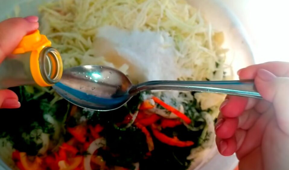 Подрібніть кріп чи будь-яку іншу зелень. Капусту пошинкуйте дуже тонко. Додайте до решти овочів. Посоліть. Додайте цукор. Влийте оцтову есенцію та олію. Ретельно перемішайте салат. Залиште на 3 години, щоб овочі промаринувалися й пустили сік.