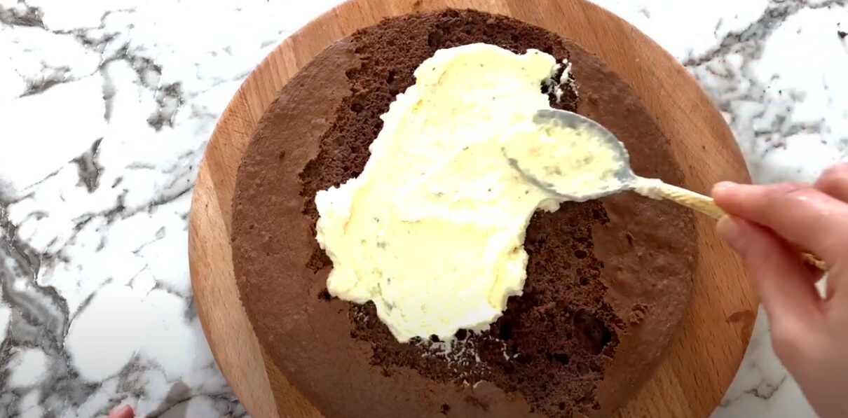 Починайте збивати вершкове масло кімнатної температури міксером, поступово додаючи по ложці прохололий крем. Наприкінці додайте ванілін на кінчику ножа. Тепер можна збирати торт. Викладіть крем поверх бісквіту. Розрівняйте та відправте до холодильника на 1,5 години.