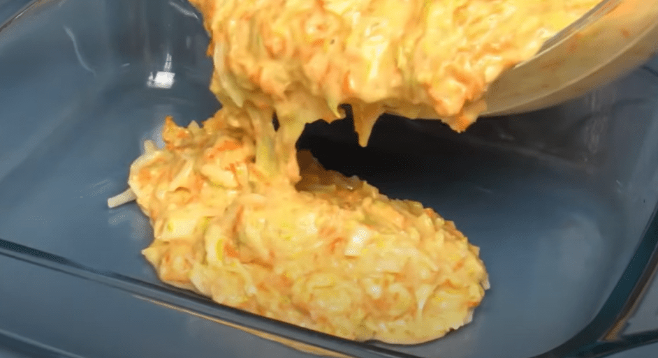 Овочі перемішайте та залийте яєчною заливкою. Ще раз усе перемішайте. Форму нічим змащувати не потрібно. Просто перекладіть кабачкову масу туди та розрівняйте верх майбутньої запіканки.