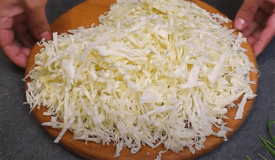 Допоки вона смажиться, дрібно пошинкуйте капусту. Перекладіть до цибулі. Смажте, допоки не зменшиться в об’ємах та не стане м’якою. Постійно перемішуйте лопаткою, щоб не пригоріла. Наприкінці посоліть та поперчіть.