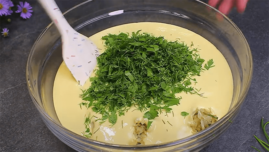 Залийте тісто в миску з підсмаженою капустою. Додайте подрібнену зелень петрушки та кропу. Ретельно перемішайте лопаткою. Формочки для кексів промастіть олією за допомогою пензлика.