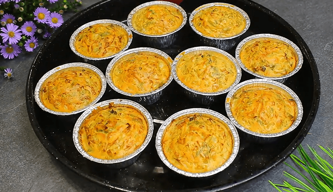 Викладіть у них капустяне тісто. Накладайте не до самого верху, залиште місце, щоб випічка піднялася. Поставте в духовку, розігріту до 190 градусів. На випікання знадобиться близько 25-30 хвилин.