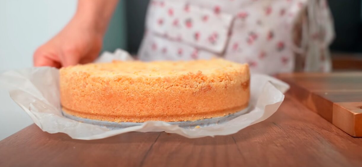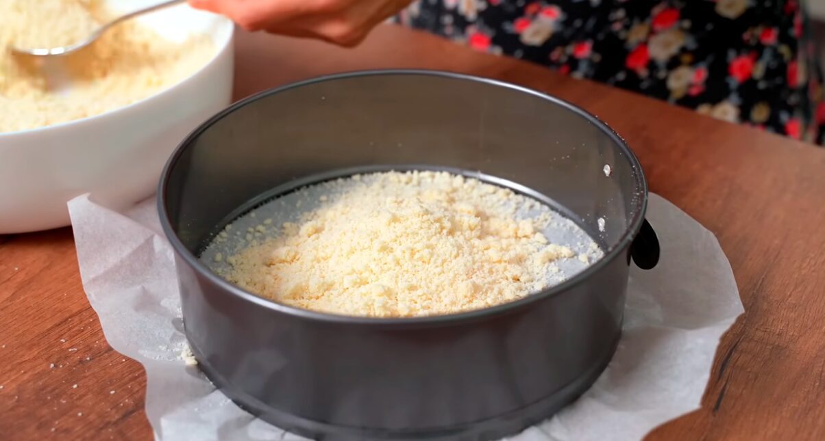 Тісто розділіть ложкою навпіл. Першу половину перекладіть у форму, дно якої вистеліть пергаментним папером. Сформуйте бортики перекладіть начинку. Розрівняйте верх. Тепер насипте зверху другу половину масляного борошна.