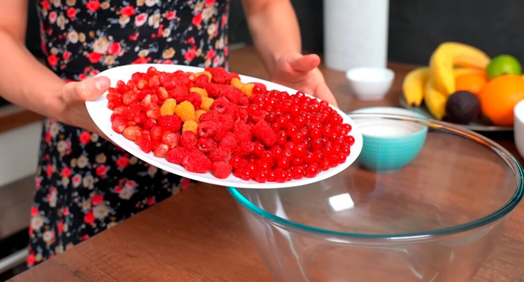 Будь-які ягоди чи їхній мікс викладіть у миску. Додайте цукор та крохмаль. Крохмаль краще брати кукурудзяний. Перемішайте. Не переймайтеся, що ягоди почали пускати сік – це нормально.