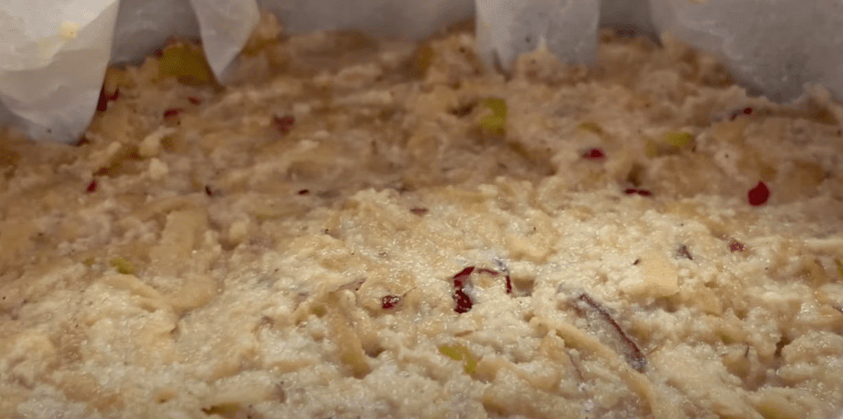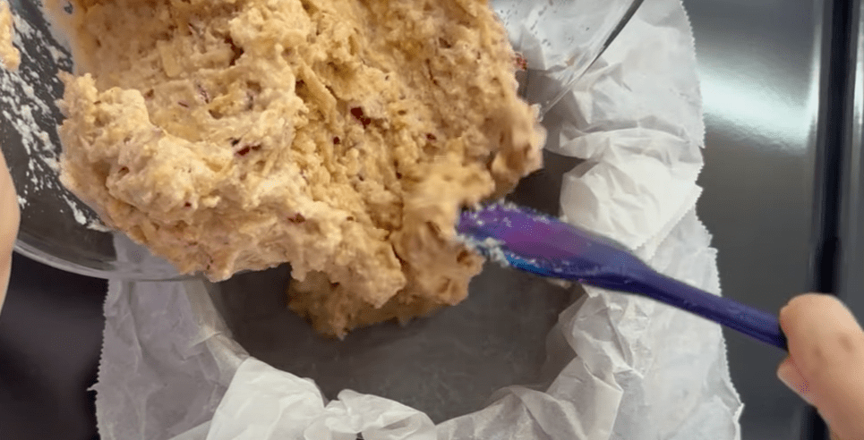Форму діаметром 16 см вистеліть пергаментом. Боки змастіть маслом. Духовку увімкніть завчасно, щоб на цей момент уже розігрілася до 180 градусів. Перекладіть тісто у форму. Розрівняйте верх.