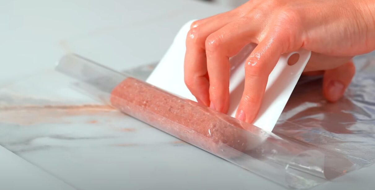 Беріть шматок фаршу, формуйте котлету, викладайте на целофан. Загорніть у поліетилен і за допомогою шпателя притисніть, щоб він розійшовся по сформованій трубочці. Ковбаска має бути завдовжки 10-12 см.