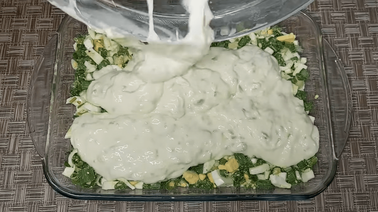 Натертий кабачок відтисніть від зайвої рідини й перекладіть до тіста. Вмішайте овоч у борошняну суміш. В окремій мисці змішайте варені яйця, які попередньо обчистьте та наріжте кубиками, та подрібнену зелену цибулю. Трішки присоліть та поперчіть на власний смак. Перемішайте.