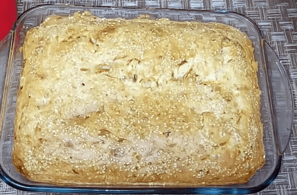 Накрийте другою половиною тіста. Підрівняйте пиріг та присипте верх насінням кунжуту. Духовку попередньо розігрійте до 180 градусів. Випікайте наливний кабачковий пиріг протягом 55-60 хвилин.