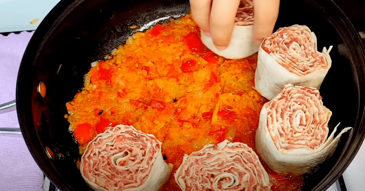 Викладіть зверху рулетики з лаваша розрізом донизу. Долийте 100 мл окропу. Накрийте кришкою. Тушіть 30 хвилин на повільному вогні. Перекладіть готові рулетики з лаваша та фаршу на тарілку й можете подавати до столу.