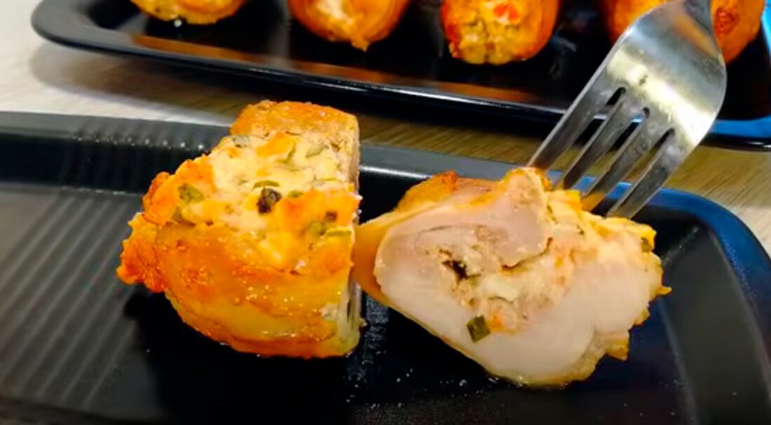 Викладіть наші напівфабрикати. На цей момент духовка вже має бути розігрітою до 180 градусів. На випікання гарячої страви піде 25-30 хвилин. Подавайте до столу фаршировані курячі стегенця відразу.