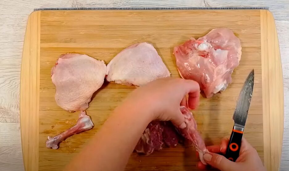 Щоб приготувати фаршировані курячі стегенця, у шматочків м’яса акуратно виріжте кісточку й зріжте шматочки м’яса, аби підрівняти поверхню. Відбийте заготовки молоточком і занурте у маринад.