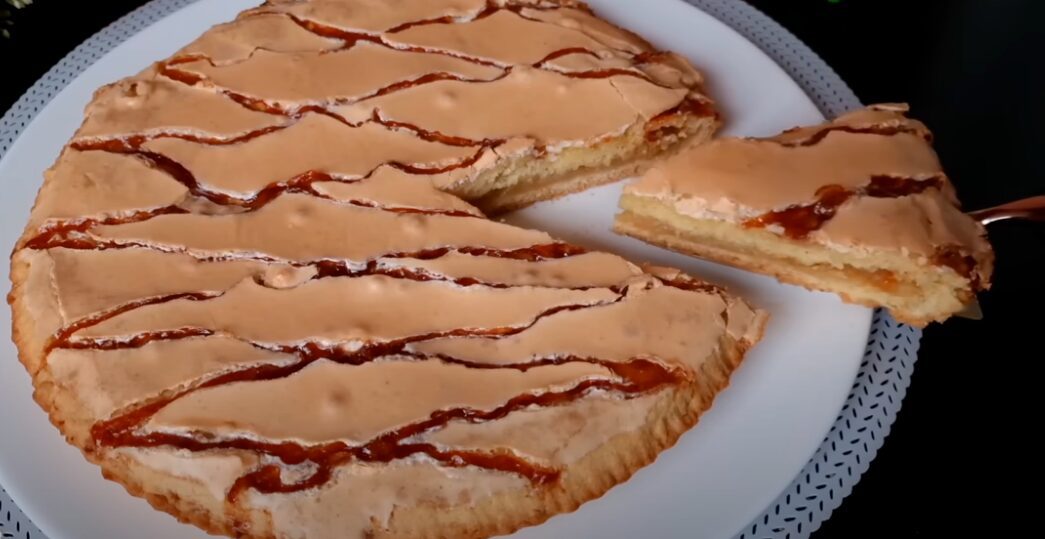 У мисочці збийте яєчний білок. Всипте цукрову пудру, продовжуючи збивати. Розподіліть повітряну масу зверху пирога лопаткою. Абрикосовий джем закладіть у кондитерський мішечок. Намалюйте смужечки вздовж і впоперек під кутом 45 градусів. Поставте яблучний пиріг у духовку. Випікайте за температури 180 градусів протягом 35-40 хвилин.