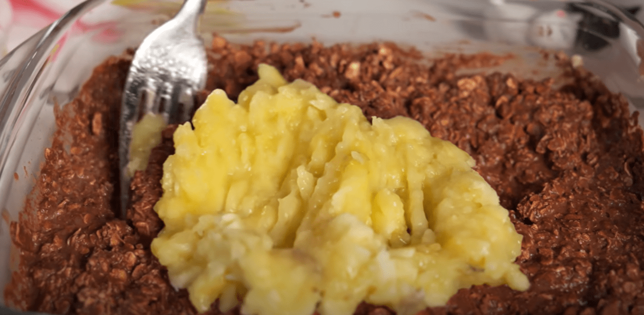 Долийте молоко. Ще раз усе перемішайте. Обчистьте стиглий банан. М’якоту розімніть виделкою. Відправте фрукт до шоколадно-вівсяної маси. Перемішайте та рівномірно розподіліть суміш по всій поверхні форми.