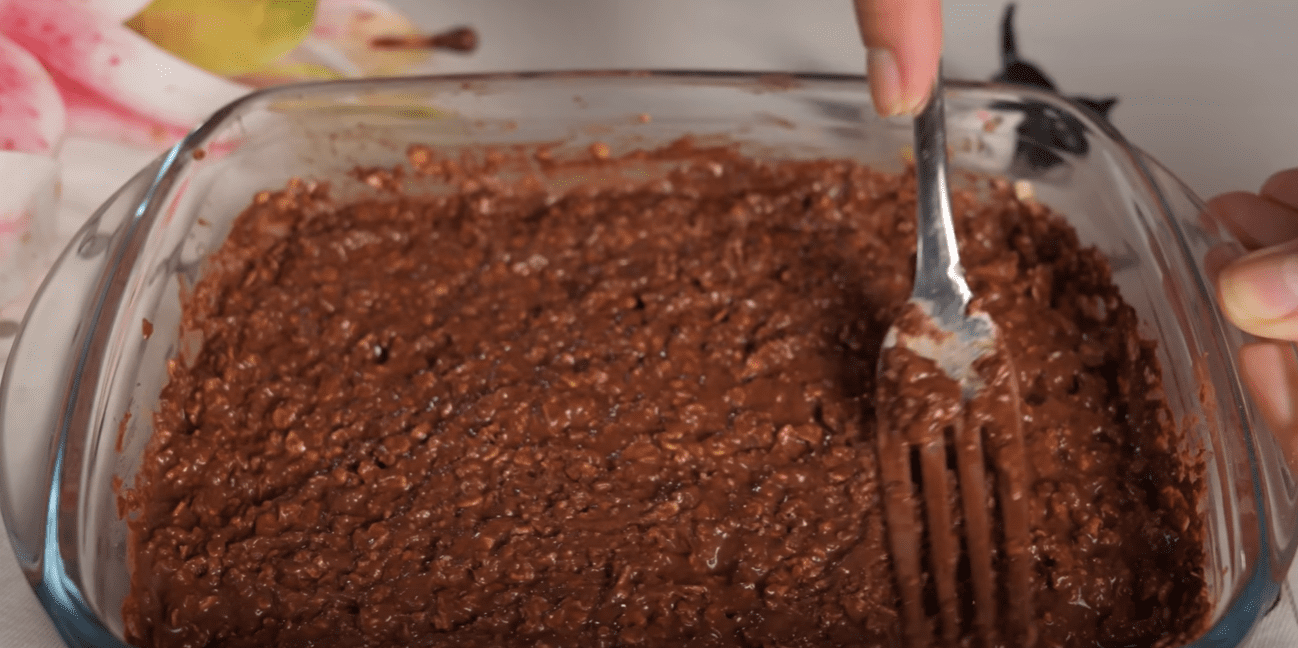 Щоб приготувати корисний тортик, вівсяні пластівці пересипте у форму для запікання. Додайте какао-порошок і ретельно перемішайте, щоб усі компоненти крупи забарвилися у коричневий колір.