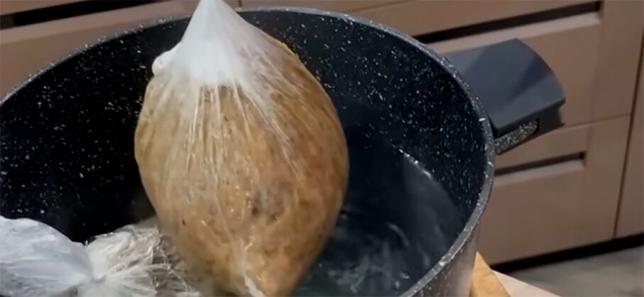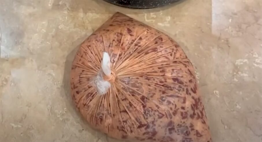 Візьміть поліетиленовий пакет і перекладіть нашу суміш туди. Випустіть із нього повітря та зав’яжіть. Щоб пакет не прорвався, про всяк випадок вдягніть на нього ще один. Його теж зав’яжіть.