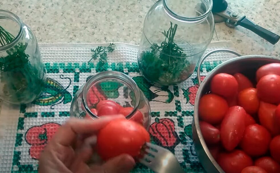Ще на дно покладіть по 2 лаврових листи та по невеличкому пучку зеленої петрушки та морквяного бадилля. Тепер викладайте вимиті помідори. Кожен із них наколюйте виделкою біля плодоніжки. Так плоди не полопаються під дією окропу.