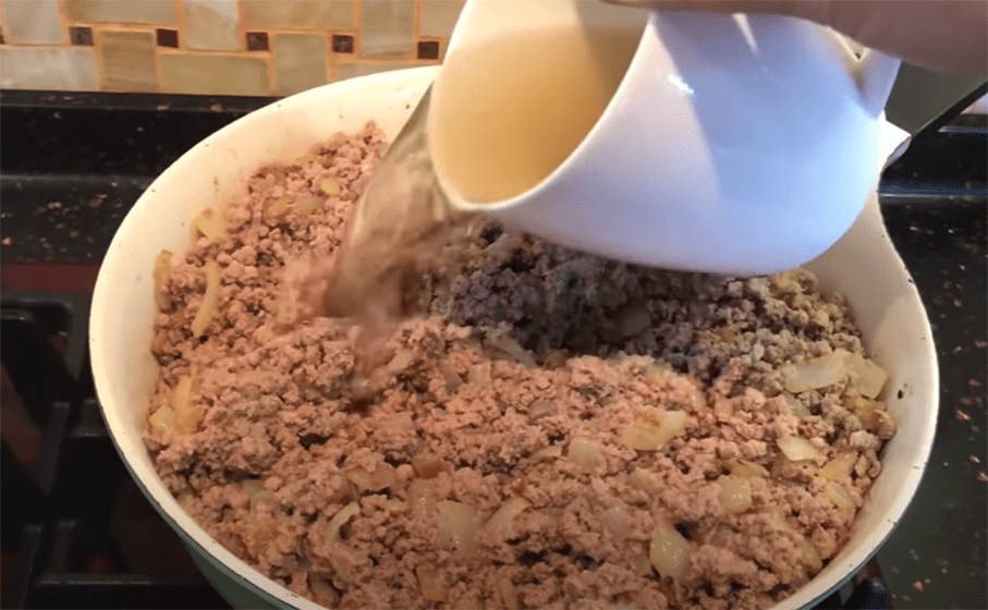 Додайте м’ясний фарш. Продовжуйте підсмажувати, не припиняючи перемішувати. Тепер влийте трішки бульйону, в якому варилося м’ясо. Перемішайте. Долийте ще трішки й ще. Якщо начинка стане занадто водянистою, не переймайтеся – завжди можна випарувати зайву рідину на сковорідці. А якусь частину бульйону м’ясо всотає в себе та стане дуже соковитим.