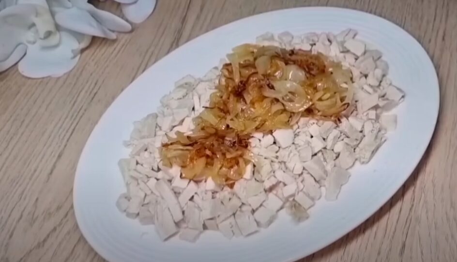 Щоб приготувати салат “Анюта”, обчищену цибулю наріжте пів кільцями та обсмажте в олії до золотавості. Куряче філе відваріть до готовності у підсоленій воді. Коли м’ясо прохолоне, наріжте його на дрібні кубики.