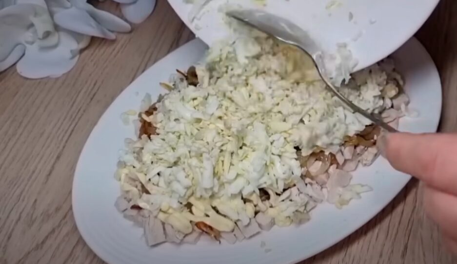 Зверху викладіть шар курячих кубиків та присипте його смаженою цибулею. Зробіть сіточку з майонезу. Далі йдуть яблучний шар плюс майонезна сіточка. Потім притрусіть салат натертим сиром.